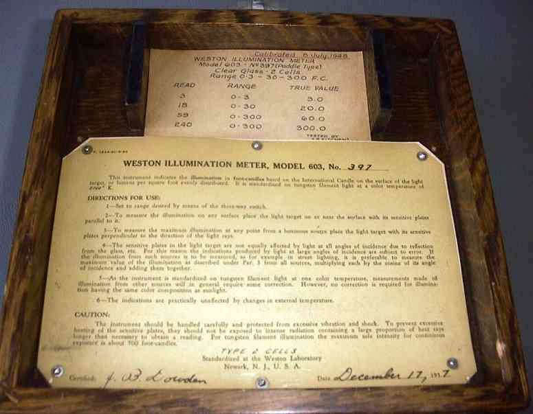 Not really an exposure meter in the modern sense but here's a "Weston Illumination Meter" model 603 within its own oak case. The case measures 8 1/2" x 8 3/4" across and it is 4 1/4" deep. It is dated with December 1937. To the right is a picture of the "paddle" which holds the twin photo-cells.