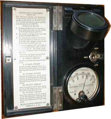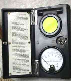 OK, not really an exposure meter in the modern sense, but a meter to measure light in foot candles. The patent number is from March 6, 1928 so this dates it to just after that. The meter works has 3 settings of High, Medium and Low. The sensor is hinged so you can point it in the direction you want to get measured. The description and scale is listed on the inside cover. It states "This instrument indicates the illumination in foot-candles based on the international candle on the surface of the light target. It is standardized on tungsten light at a color temperature of 2700 degrees K". The directions for use are also printed on the case. The meter has a nice hinged door for protection and a leather handle for carrying. It weighs around 2 pounds and is about 7" by 3 ½" by 2".