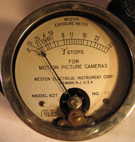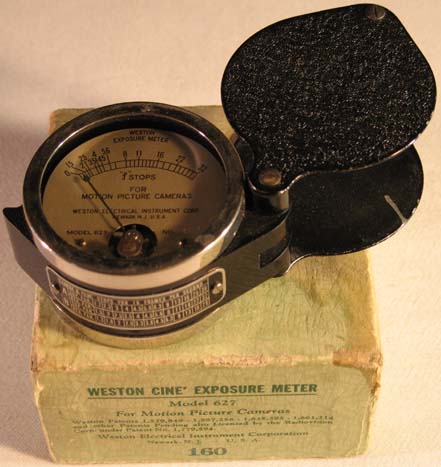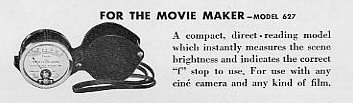 Like a large jewellers loup with black crackle metal cover, black plastic and chrome body. No calculator dial - the meter has a conversion plate on the side and uses the old 16 frames per second cine speed. Made in Newark.