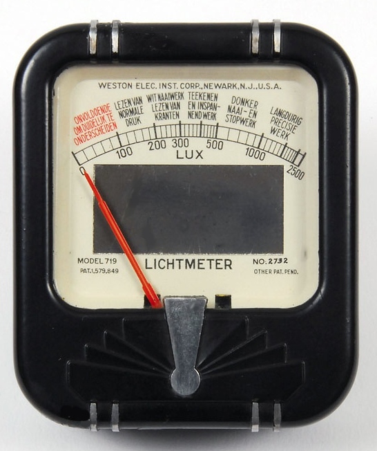 The Weston Model 719 Lightmeter shown here is a Dutch model with a scale in Lux. It was designed for measuring the light levels in workplaces rather than for photographic use. The grey area on the meter face is the photo cell itself.Made in New Jersey around the mid 1950s.
