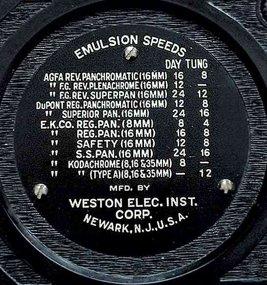 Let's look at some of the films of yesteryear from the back of the meter. Panchromatic or pan as it was often shortened to, was a black and white film - the word panchromatic meaning sensitive to all colours. Some older films were called ortho - these were not sensitive to red and resulted in the very glamourous almost black lips of early silent movie stars. FG is fine grain - a very relative term indeed compared to todays films. EK is the familiar Eastman Kodak black and white pan films and Kodachrome in both daylight and (A)rtificial (tungsten) light forms. The curious work Safety refers to the fact that early films uses a very flammable nitrate base.
