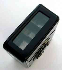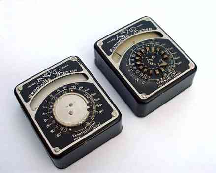 The two meters shown are varients of model - the sligtly newer meter (on the right) has an easier to use dial. As you can see, the meter is quite deep and has a large selenium cell deeply recessed into the front. It's aiming accuracy is enhanced by two internal baffles. The meter has only one sensitivity range but is surprisingly sensitive. The black pointer is aligned with the red needle by turning the dial, and the exposure read off. Speeds are in the H&D scale (Hurter and Driffield) from 200 to 5000.